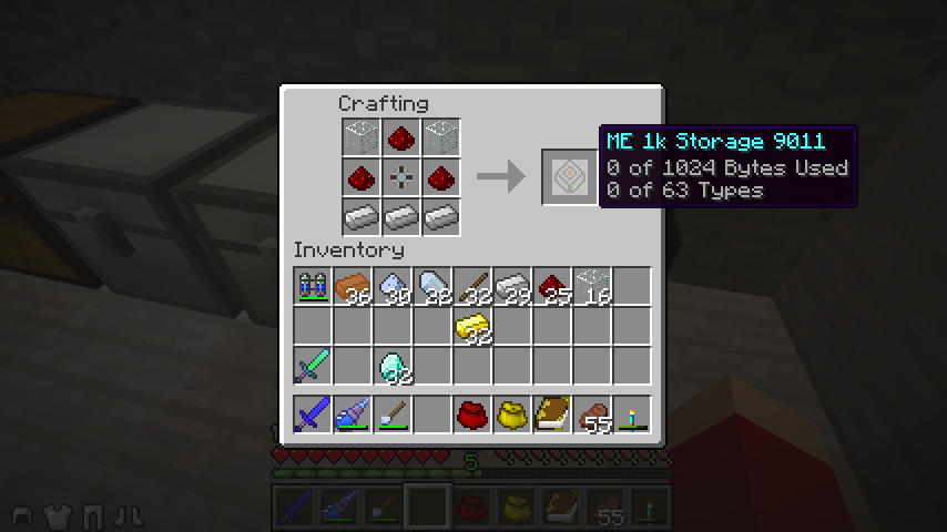 ストレージセル、ガラス*2、レッドストーン*3、鉄インゴット*3でME1kストレージ(ME 1k Storage)。