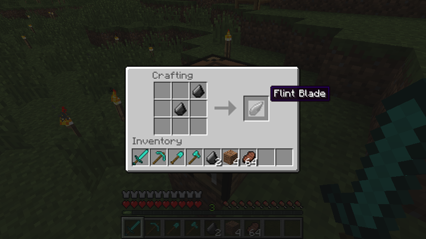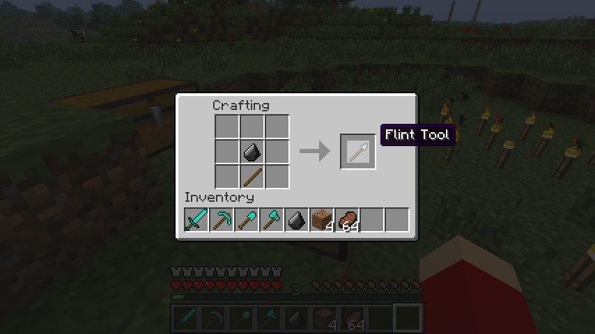 PrimitiveToolsの開発動機はHardcoreWoodのためということですが、フリントツールを作るためには木の棒が必要で、そのためには結局AnotherRecipesなどの木の棒を入手できるMODを入れないといけないため、あまり有機的な繋がりになっていないところが残念です。