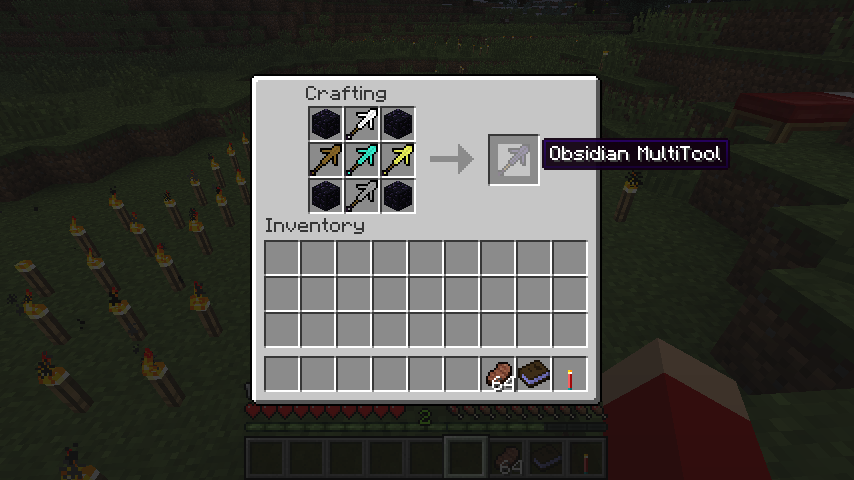 木マルチツール、石マルチツール、鉄マルチツール、金マルチツール、ダイヤマルチツール、黒曜石*4で黒曜石マルチツール(Obsidan MultiTool)。