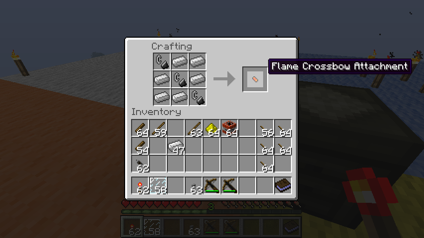 鉄インゴット*6、火打ち石*3で炎アタッチメント(Flame Crossbpw Attachment)。