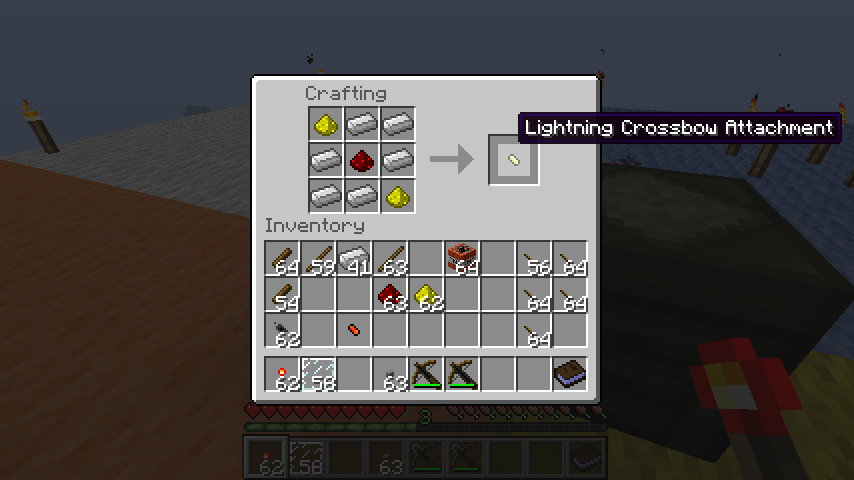 鉄インゴット*6、レッドストーン、グロウストーンダスト*2で雷アタッチメント(Lightning Crossbpw Attachment)。