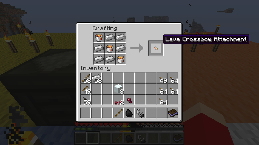 鉄インゴット*6、溶岩バケツ*3で溶岩アタッチメント(Lava Crossbpw Attachment)。