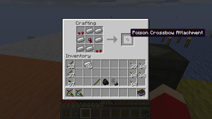 鉄インゴット*6、蜘蛛の目、ネザーウォート*2で毒アタッチメント(Poison Crossbpw Attachment)。