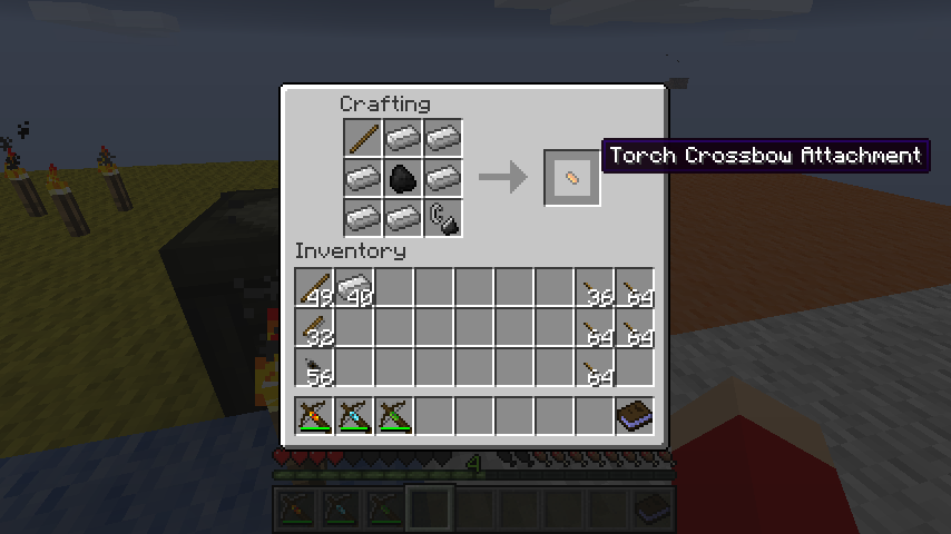 最後にトーチアタッチメント(Torch Crossbpw Attachment)は鉄インゴット*6、木の棒、石炭、火打ち石。