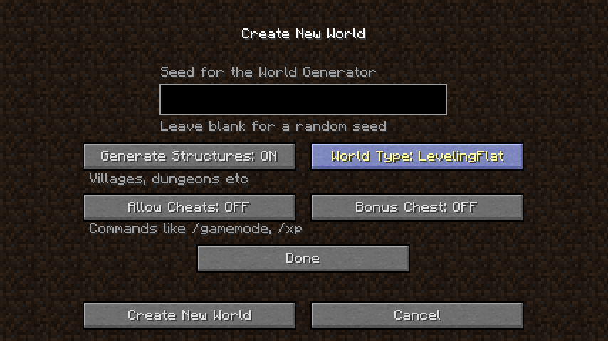 これを導入すると、ワールド生成時のタイプに「LevelingFlat」が追加されます。