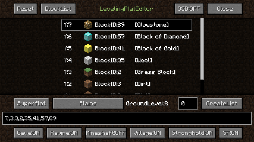 鉱石などを追加してアイテムに不自由しないスーパーフラットにしたり、ある程度深さのある実験場が欲しいといったときに役立つでしょう。