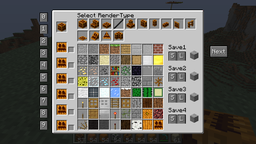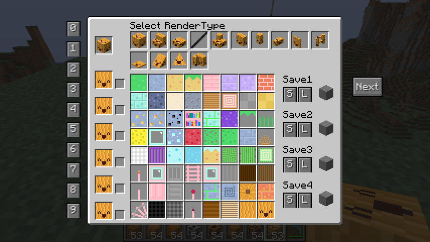 ブロックが8種類*ブロックごとにテクスチャファイルが10枚*テクスチャファイル一枚につき256種類のテクスチャということで、合計20480種類の見た目が選択可能になりました。