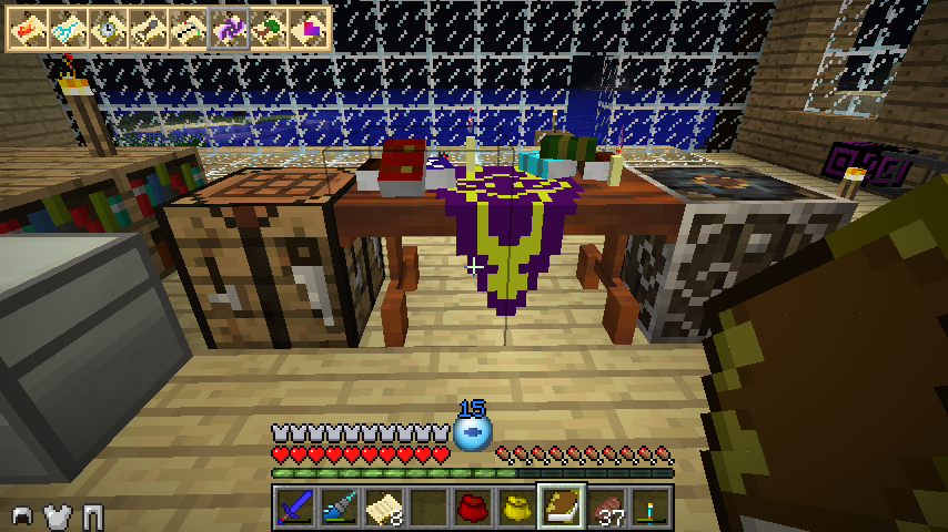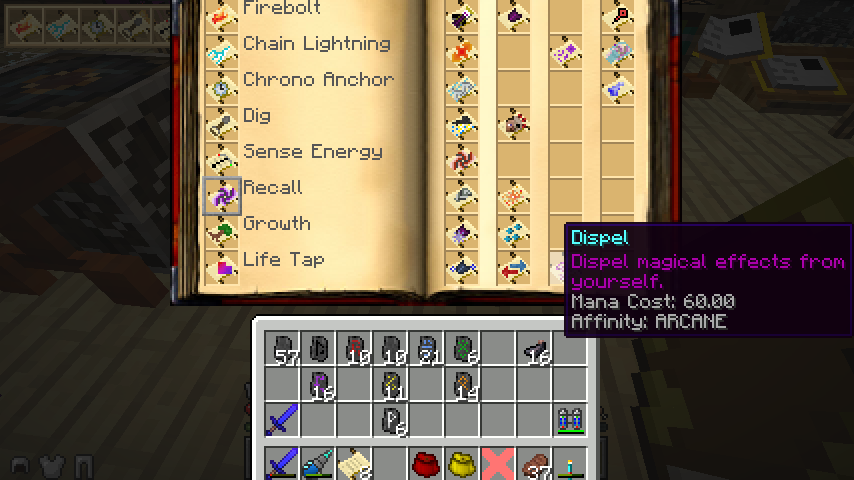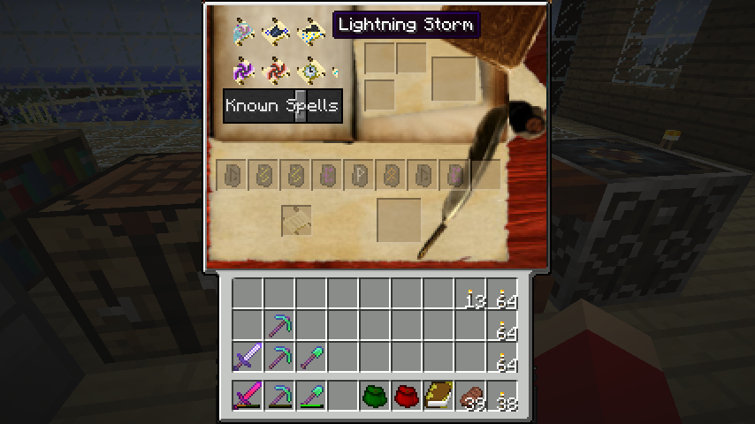 これを使用すると魔法の作り方を覚え、文机のGUI左上のKnown Spellsというところに出てくるようになります。