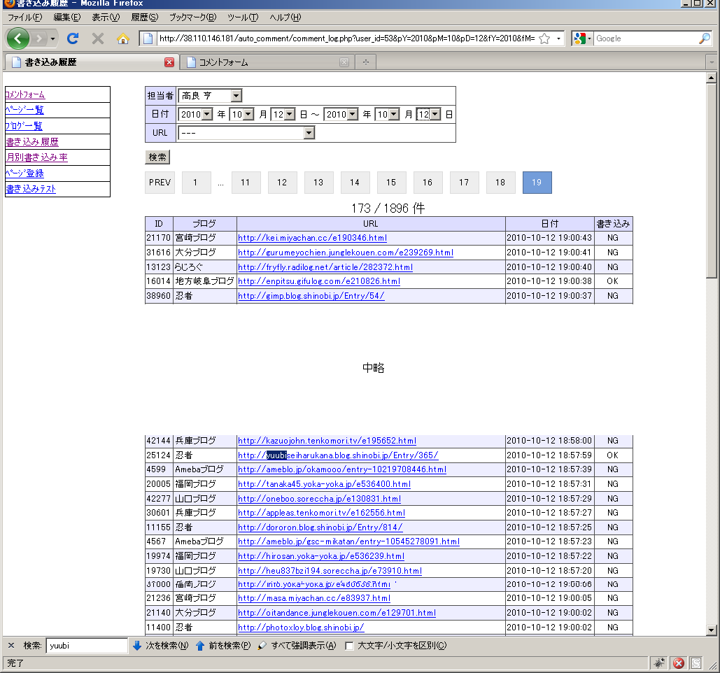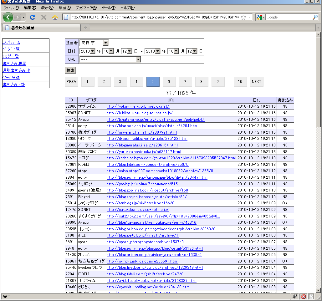 http://38.110.146.181/auto_comment/comment_log.php?user_id=53&pY=2010&pM=10&pD=12&fY=2010&fM=10&fD=12&c_url=0&search=1&p=5