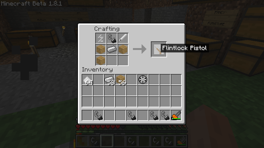 木材*3、鉄、火打ち石、スプリング、銃床でフリントロックピストル(FlintLock Pistol)