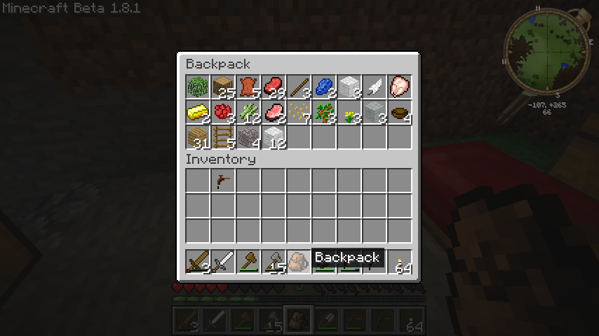 バックパック(Backpack)を追加する小規模なMODです。