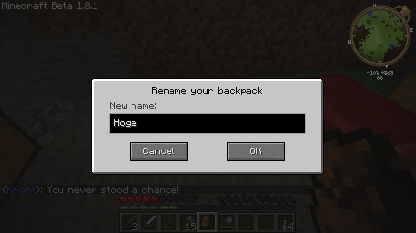 あとは、スニークキー(左シフト)を押しながらバックパックを使うと、名前をつけることができます。
