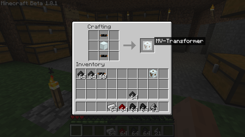 中圧変換装置(MV Transformer)で高圧→中圧(128EU)に、低圧変換装置(LV Transformer)で中圧→低圧(32EU)にと二段階の変換を経る必要があります。