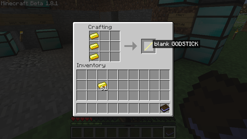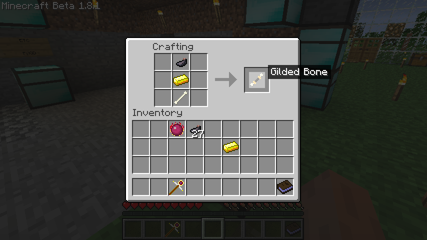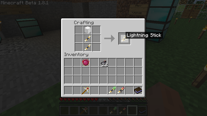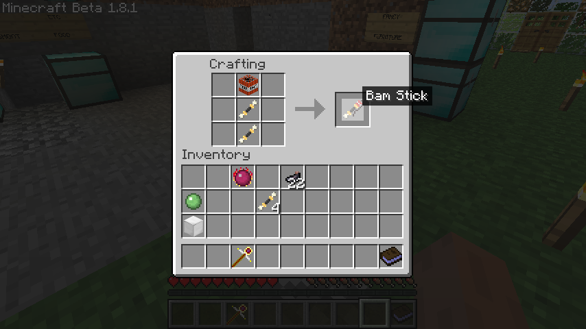 その後、金メッキの骨*2とTNTでBam Stick、金メッキの骨*2とスライムボールでJump Stick、金メッキの骨*2と鉄ブロックでLightning Stickの3種類の杖ができあがります。