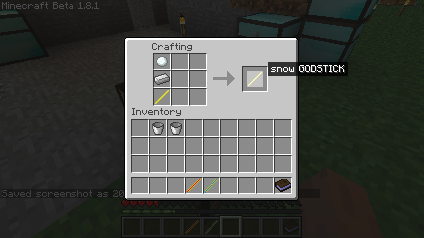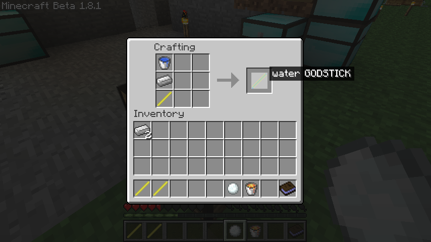 そしてblank GODSTICK+鉄インゴット+水バケツでwater GODSTICK、blank GODSTICK+鉄インゴット+溶岩バケツでlava GODSTICK、blank GODSTICK+鉄インゴット+雪玉でsnow GODSTICKと3種類の棒ができあがります。
