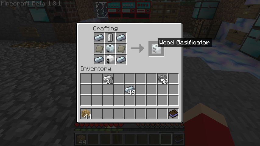 抽出機、鉄のかまど、空のセル、合金板*2、精錬鉄*4で木ガス化装置(Wood Gasificator)。