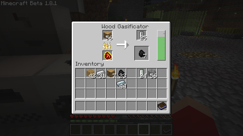 これは電気を使用しない装置で、左下のスロットに燃料、左上に原木を入れると燃焼し始め、原木を燃やして右下のスロットに木炭を作成しつつ、右端の木ガスゲージが徐々にたまります。