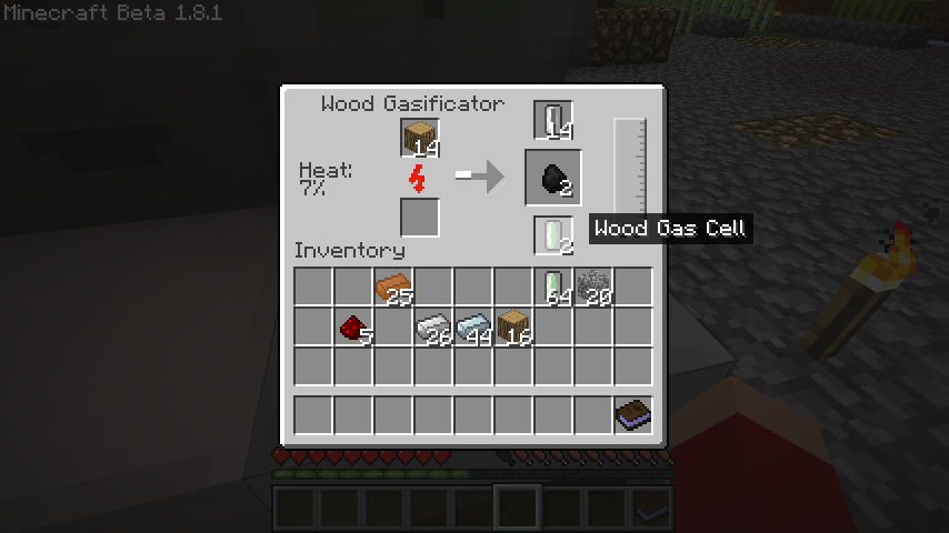右上のスロットに空のセルを入れると、たまっている木ガスを詰めて右下のスロットに木ガスセル(Wood Gas Cell)を作成します。