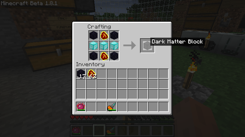 ダークマターブロック(Dark Matter Block)のレシピは、ダイヤブロック*3、黒曜石*4、メビウス燃料*2でダイヤが27個必要です。