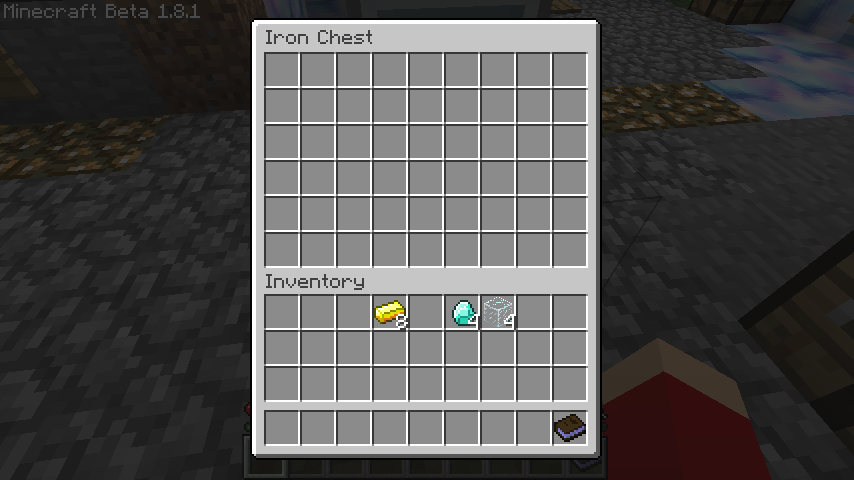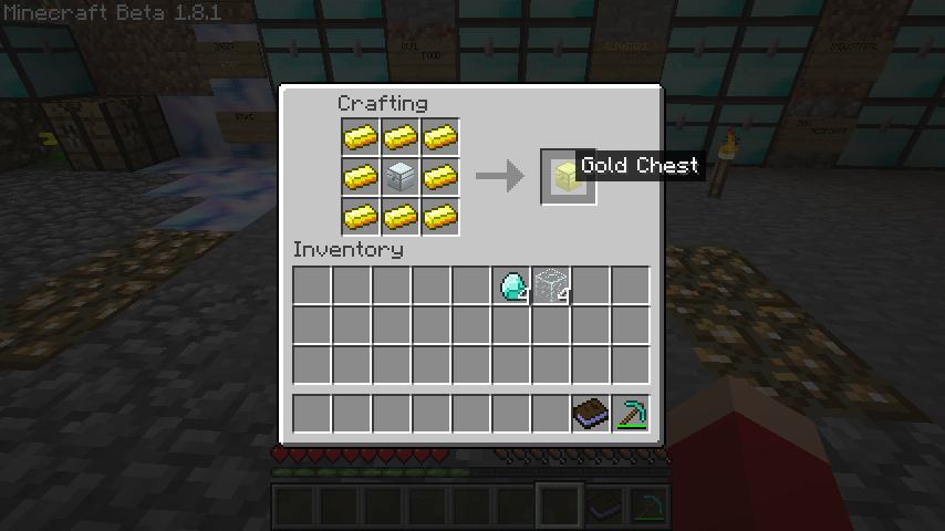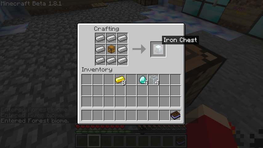 チェスト+鉄インゴット*7で鉄チェスト(Iron Chest)、鉄チェスト+金インゴット*7で金チェスト(Gold Chest)、金チェスト+ダイヤモンド*4+ガラス*4でダイヤモンドチェスト(Diamond Chest)になります。