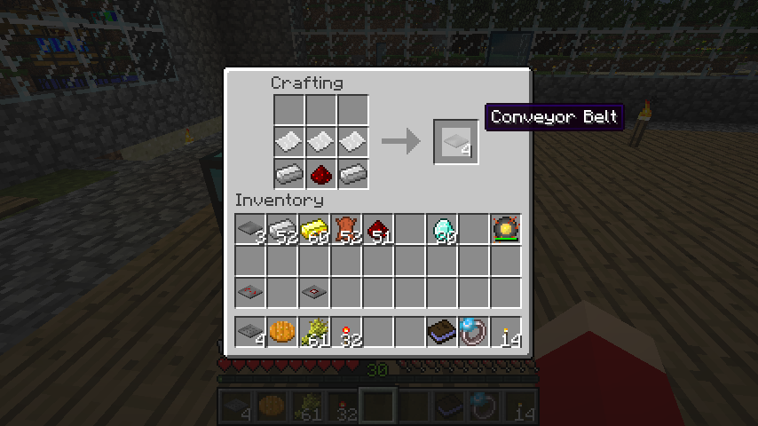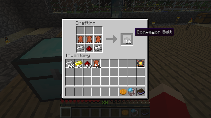 コンベアベルト(Conveyor Belt)は皮*3、鉄インゴット*2、レッドストーン*1。