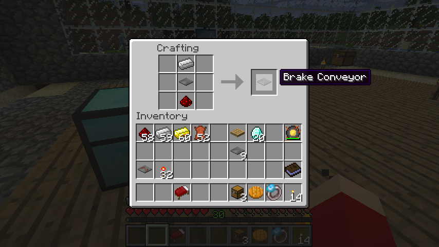 次にブレーキコンベア(Brake Conveyor)は鉄インゴット、コンベアベルト、レッドストーン。