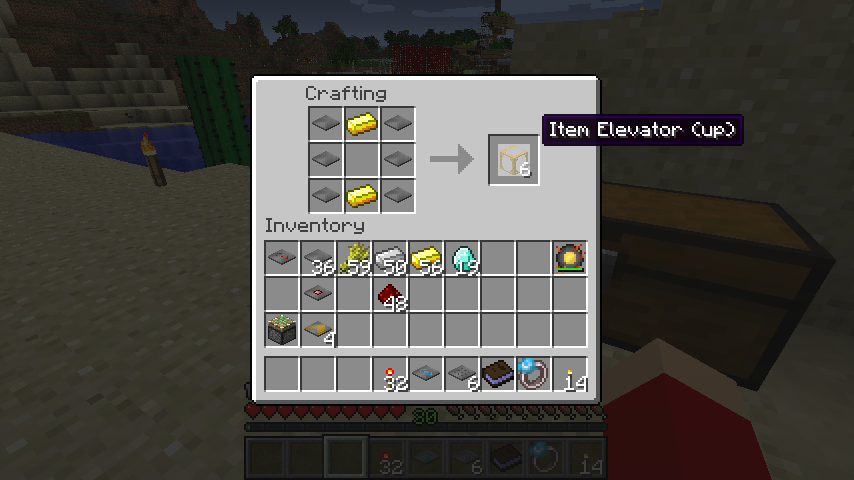 下降エレベータ(Item Descender (down))はコンベアベルト*6、金インゴット*2、レッドストーン。