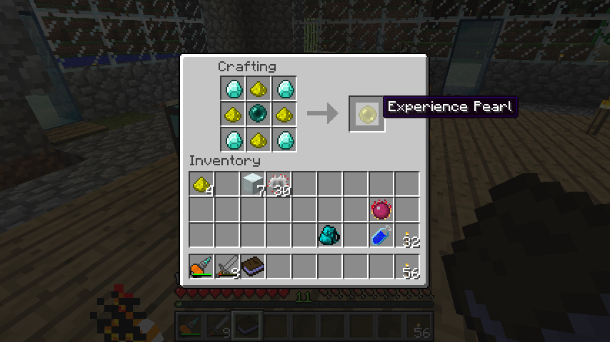 レシピは、まずエンダーパール、グロウストーンダスト*4、ダイヤモンド*4で経験値宝珠(Experimence Pearl)。