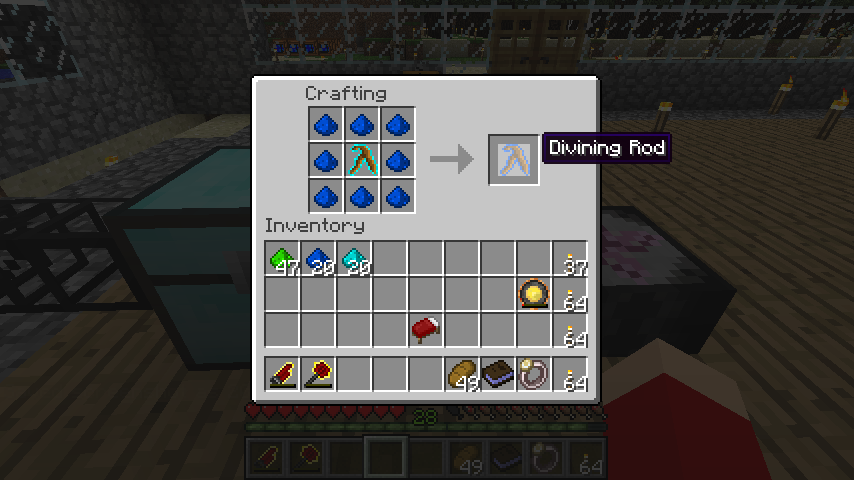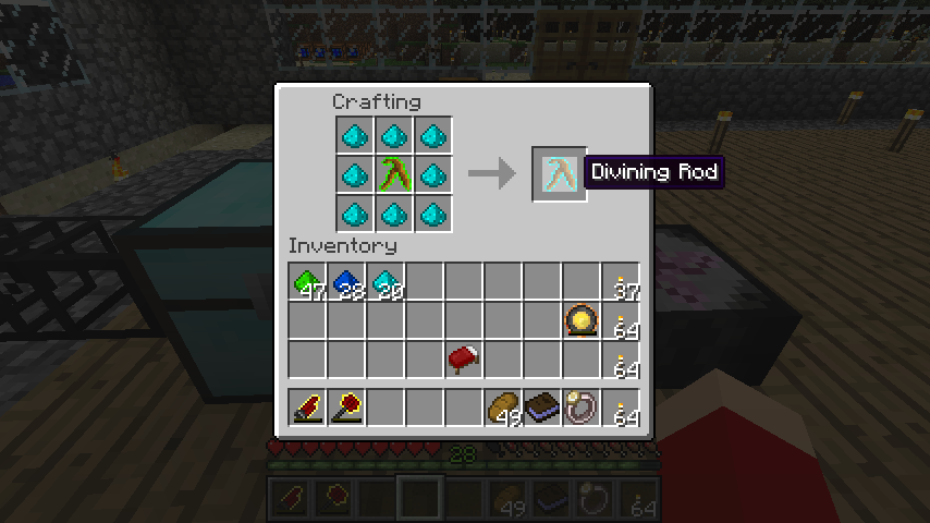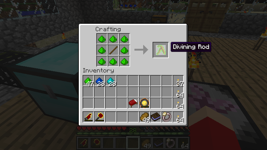 木の棒+共有結合粉(Si)*8で占い棒緑(Divining Rod)。