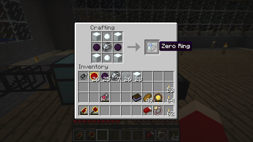 鉄の腕輪、ダークマター*2、雪ブロック*4、雪玉*2でゼロリング(Zero Ring)。