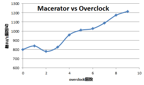 とりあえず、実測値でoverclockの個数を増やした場合の、maceratorの性能変化を調べてみた。