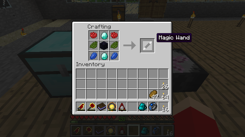 魔法の杖(Magic Wand)のレシピは黒曜石、ダイヤモンド*2、赤染料*2、緑染料*2、ラピスラズリ*2。
