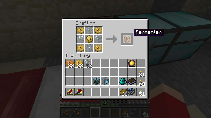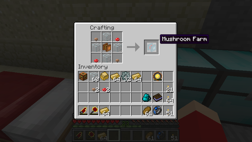 キノコ農業マシン(Mushroom Farm)は通常の木用林業マシン、ガラス*4、赤キノコ*2、茶キノコ*2。