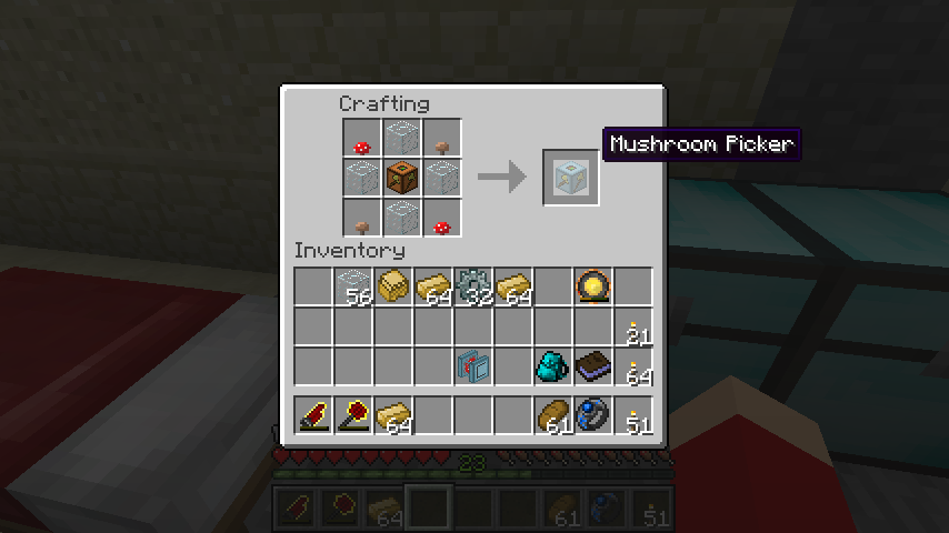 キノコ伐採マシン(Mushroom Picker)は通常の木用伐採マシン、ガラス*4、赤キノコ*2、茶キノコ*2。