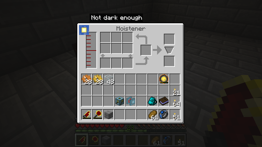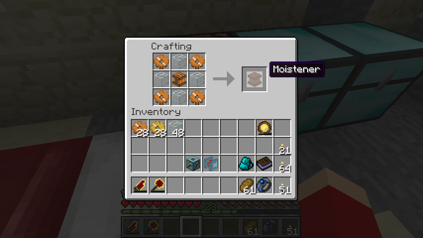 必要なアイテムは小麦、種子、水の3種類で、これらを素材に菌糸ブロックを作成し、また麦の老廃物としてMulchを排出します。