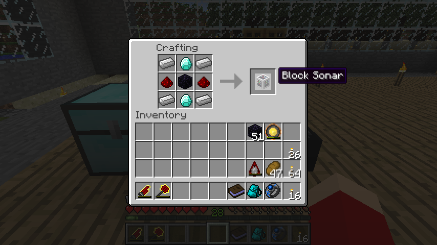 ソナー(Block Sonar)のレシピは黒曜石、ダイヤモンド*2、レッドストーン*2、鉄インゴット*4。
