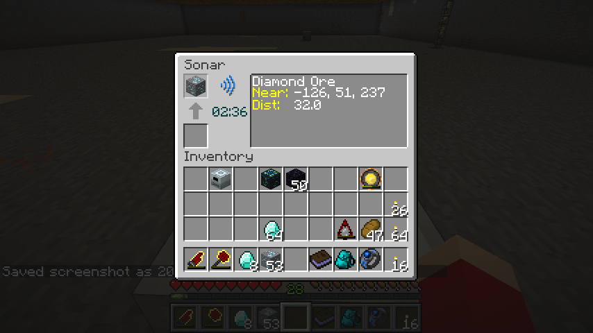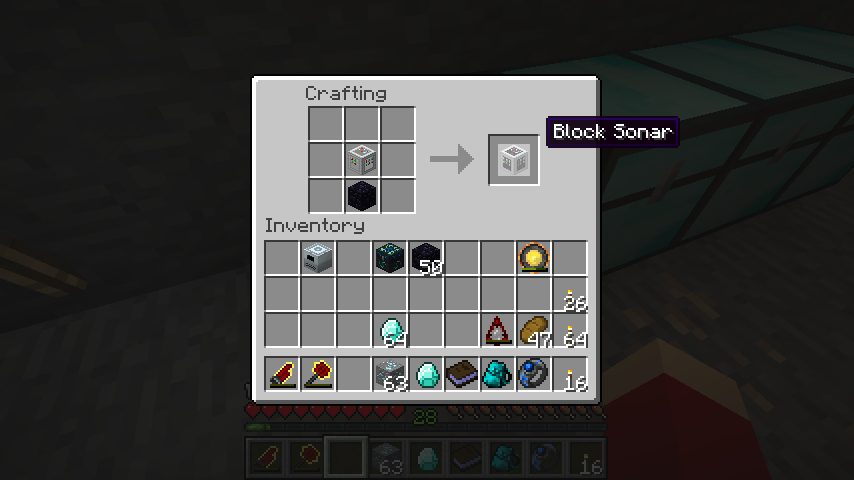 ただし、探知距離はソナーを中心とした64*64*64ブロックにしか及ばないようです。