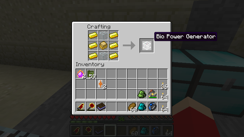 バイオ発電機(Bio Power Generator)は頑丈なマシン、ガラス*2、金インゴット*6。