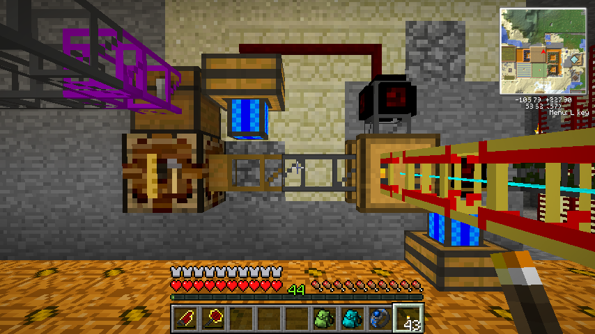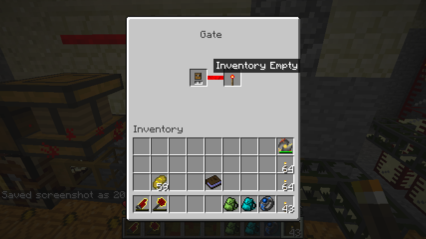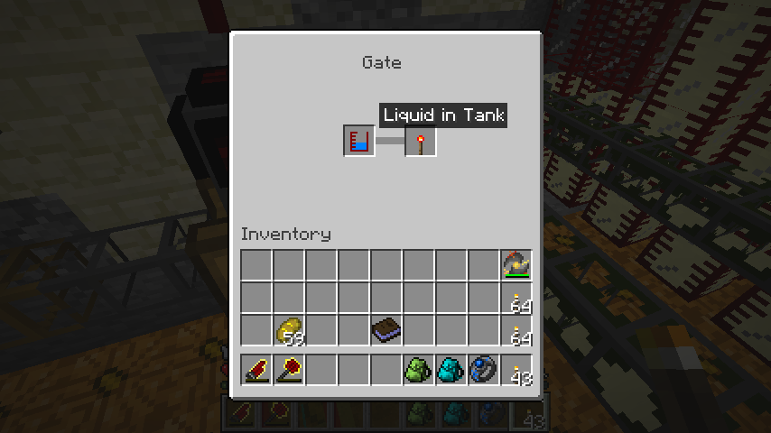 上向きの石パイプはダミーで、ゲートには「インベントリが空であれば(Inventory Empty)」「レッドストーン出力する(Redstone Signal)」を仕掛けています。