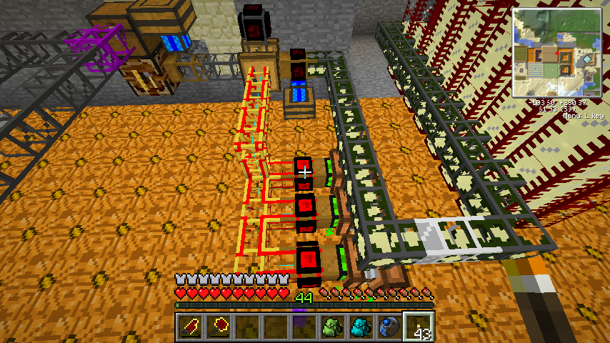 右に液体木パイプには「液体が入っていれば(Liquid in Tank)」「レッドストーン出力する(Redstone Signal)」のゲートを仕込み、シードオイルができた先から搬出しています。