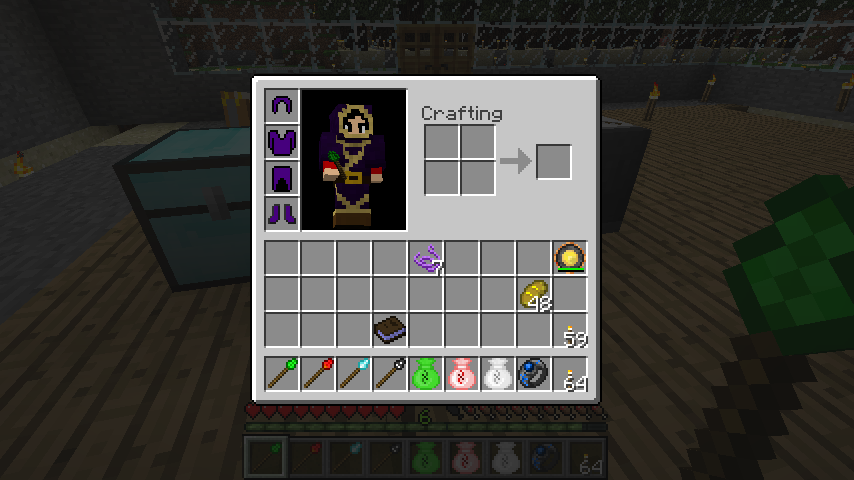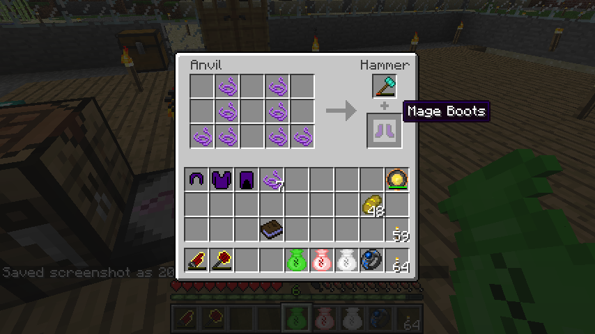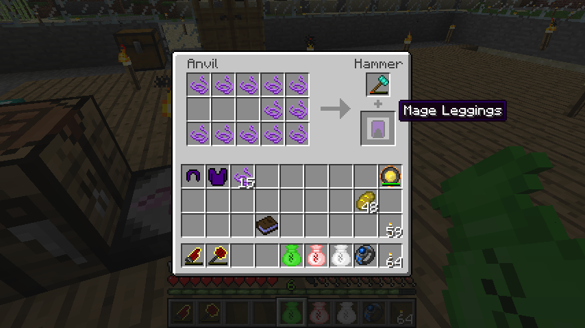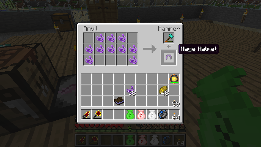 魔法の糸*10でメイジヘルメット(Mage Hermet)、魔法の糸*11でメイジ鎧(Mage Chestplate)、魔法の糸*12でメイジレギンズ(Mage Leggings)、魔法の糸*8でメイジブーツ(Mage Boots)。