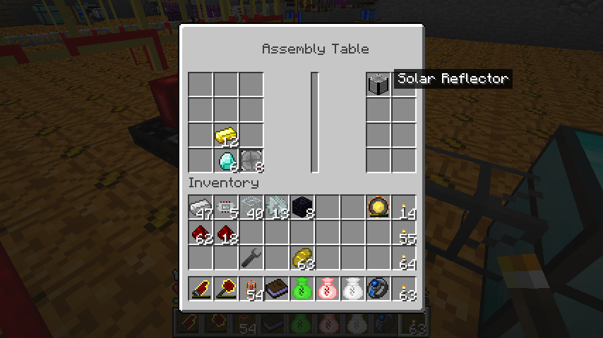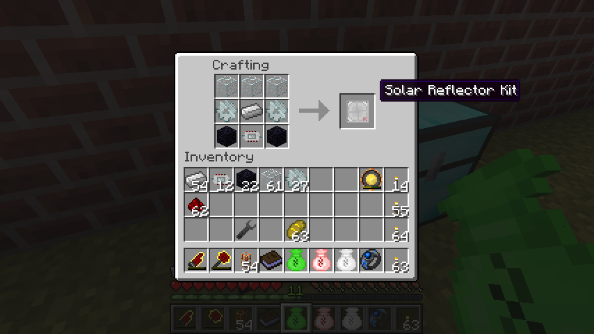 集光パネルことソーラーリフレクタキット(Solar Reflector Kit)は鉄パワーコア、鉄の歯車*2、鉄インゴット、ガラス*3、黒曜石*2。