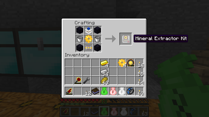 まず鉱物抽出炉キット(Mineral Extractor Kit)は金パワーコア、金の歯車、鉄エンジン、バケツ*2、黒曜石*4。