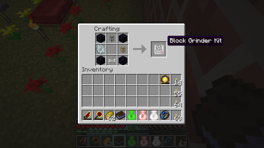 ブロックグラインダーキット(Block Grinder Kit)のレシピは鉄パワーコア、鉄の歯車、木パイプ、石パイプ、黒曜石*4。