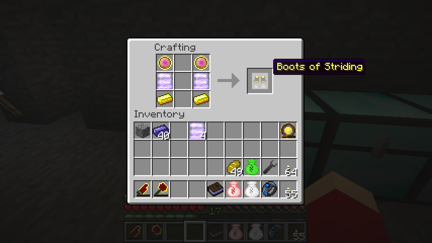 Incandescent Nitor*2、魔法布*2、金インゴット*2で闊歩のブーツ(Boots of Striding)。