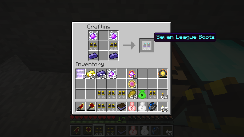 闊歩のブーツ*2、帯電の魔力クリスタル*2、Thaumium Ingot*2で千里のブーツ(Seven League Boots)。