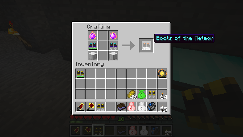 最後に千里のブーツ*2、炎の魔力クリスタル*2、鉄ブロック*2で流星のブーツ(Boots of the Meteor)。