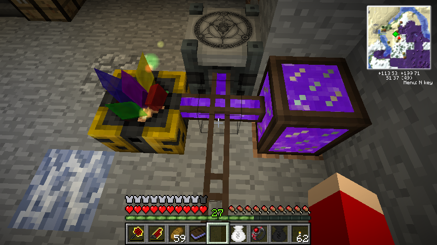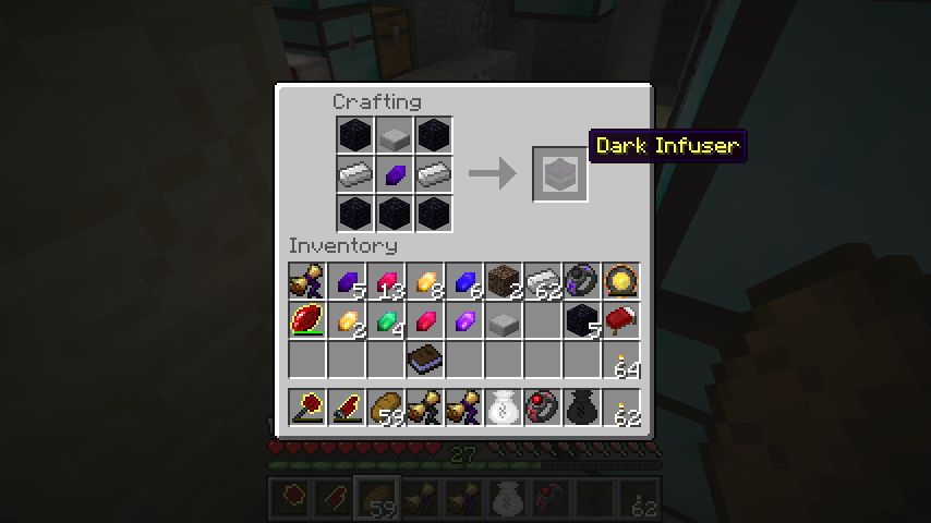 魔力凝集器からできあがってしまった汚染クリスタル、石の半ブロック、鉄インゴット*2、黒曜石*5で闇の魔力注入器、No38"Dark Infuser"ができあがります。
