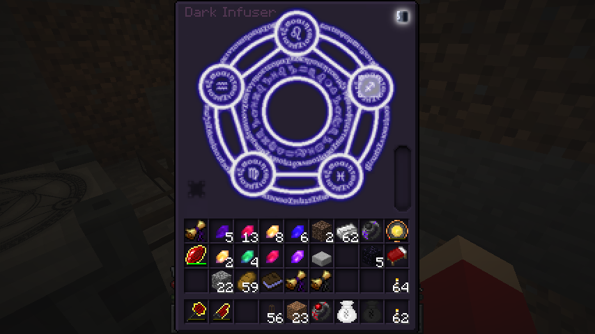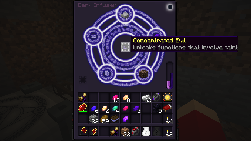 闇の魔力注入器に汚染された魔力クリスタル、ソウルサンド、石の半ブロックを突っこむことで、No12"Concentrated Evil"ができます。