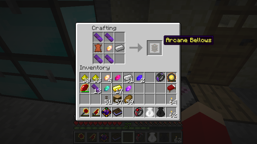 魔力を込めた木材*4、皮、鉄インゴット、Vaporous Crystalで神秘のふいご(Arcane Bellows)。